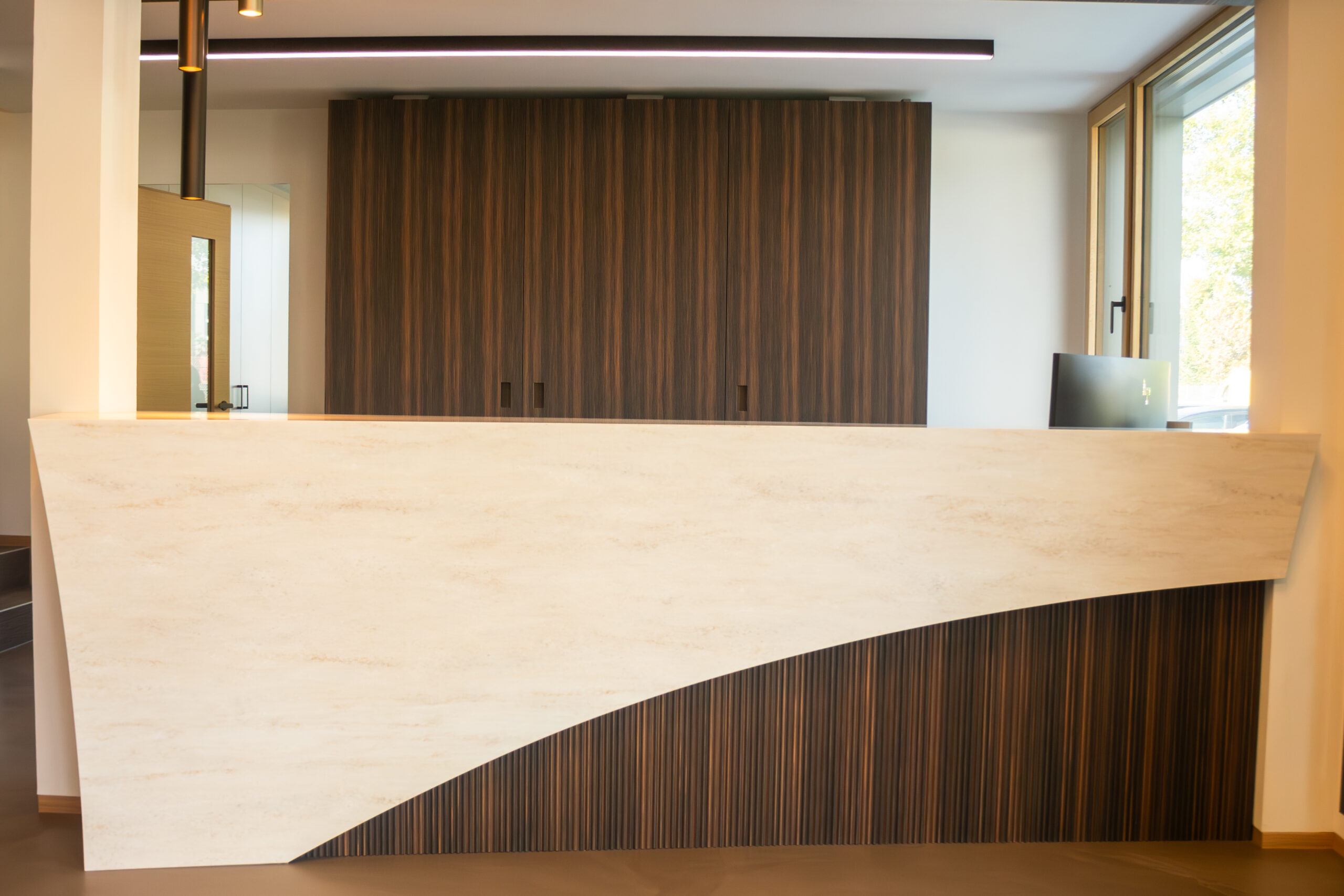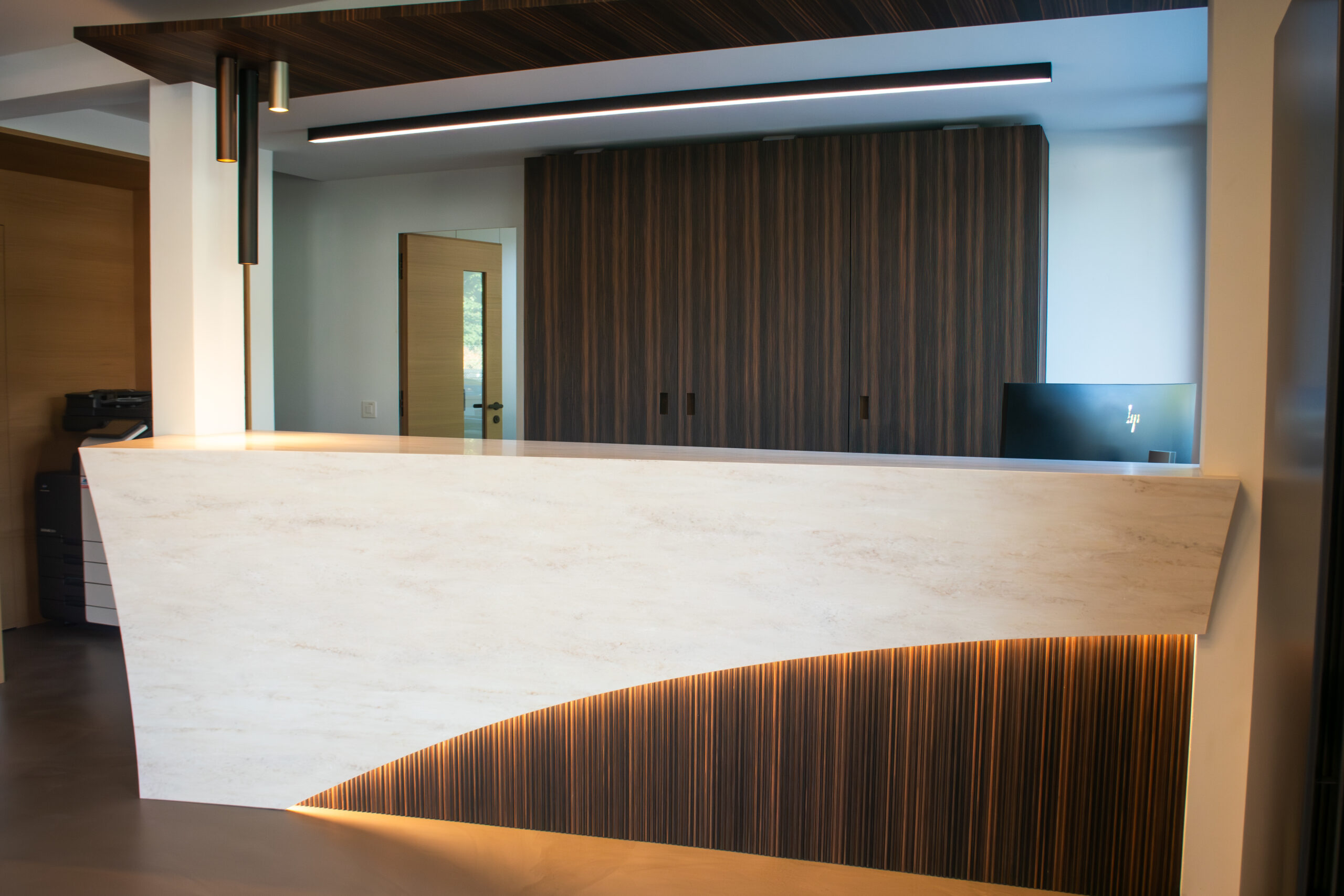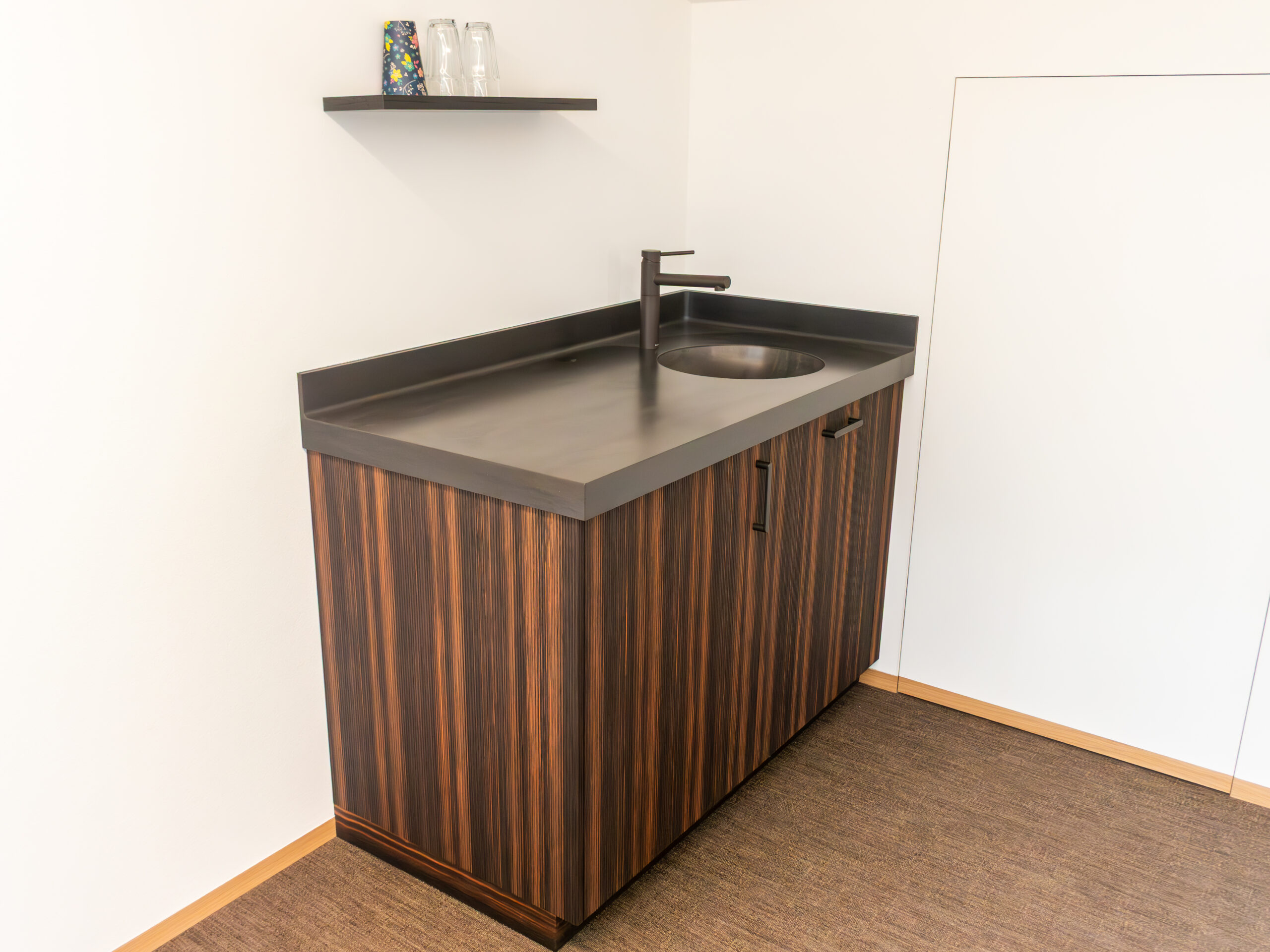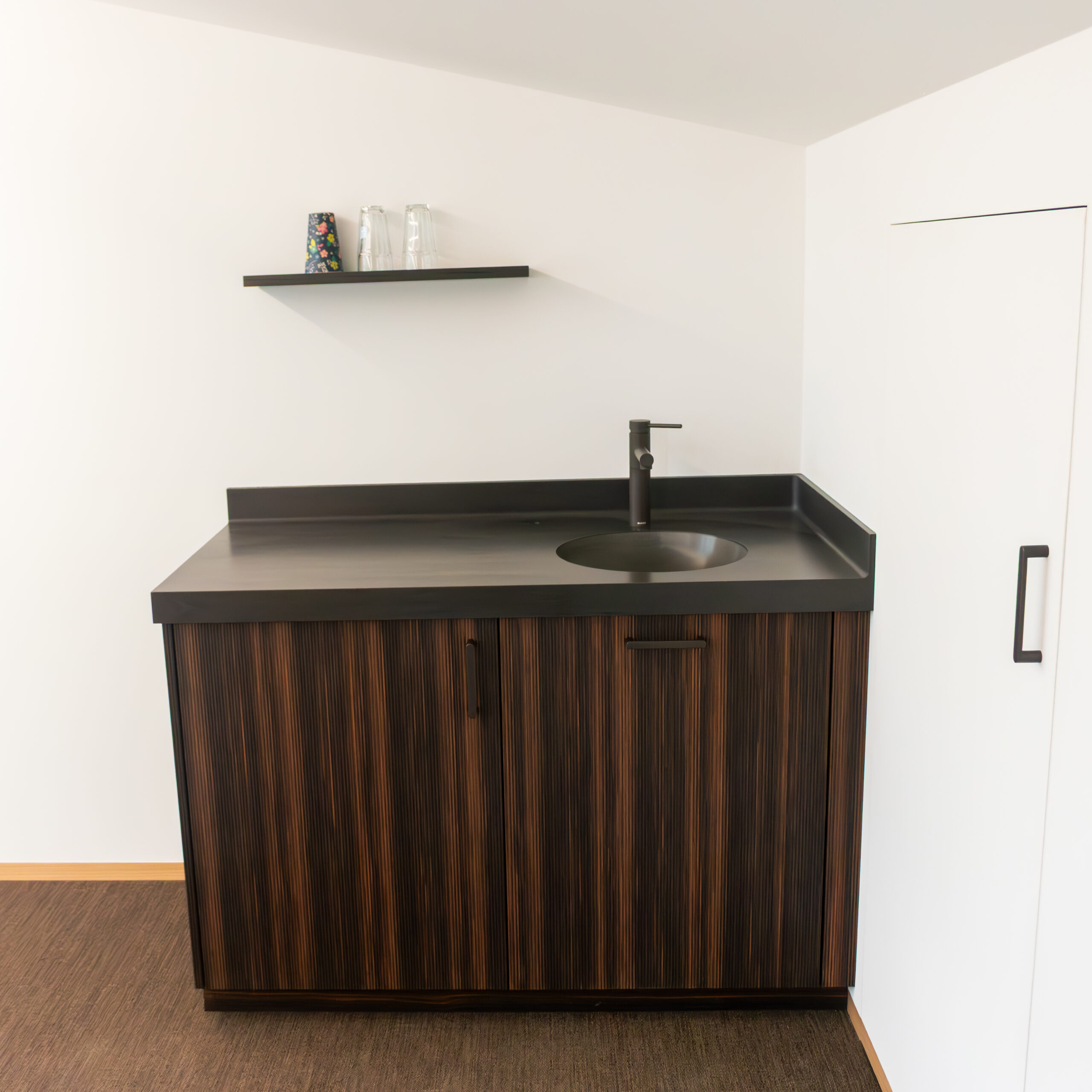 Bureaux administratifs Minnig SA Lieu Bulle Catégorie Agencement intérieur Date 2025 Réalisations Réception, cuisinette, table réunion, meuble lavabo Photos Minnig SA / Inventaire SA Projet & fabrication Minnig SA
